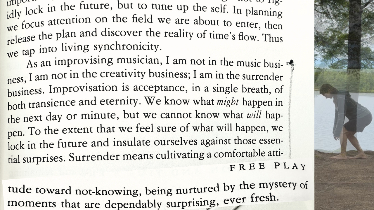 As an improvising musician, I am not in the music business, I am not in the creativity business; I am in the surrender business. Improvisation is acceptance, in a single breath, of both transient and eternity. We know what might happen in the next day or minute, but we cannot know what will happen. To the extent that we feel sure of what will happen we will lock in the future and insulate ourselves against those essential surprises. Surrender means cultivating a comfortable attitude toward not knowing, being nurtured by the mystery of moments that are dependably surprising, ever fresh.” - Stephen Nachmanovitch, Free Play, p. 22
